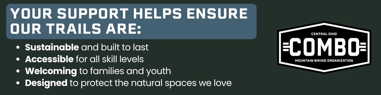 COMBO is a 501(c)(3) nonprofit, volunteer-led organization with a core mission: Building Trails & Building Community.